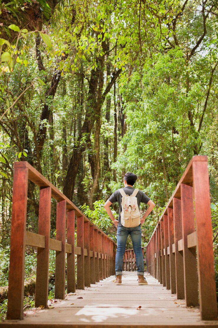 Под мостом простирается глубокое ущелье, которое не выглядит угрожающим благодаря густой растительности тропиков.