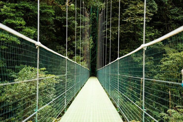 По завершении маршрута, канатная дорога доставляет пассажиров на станцию, находящуюся на вершине горы, возвышающейся над подвесным мостом.
