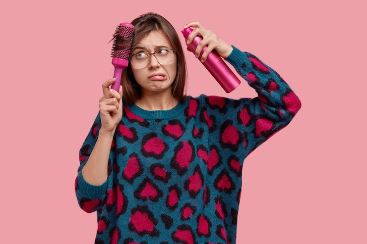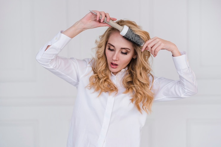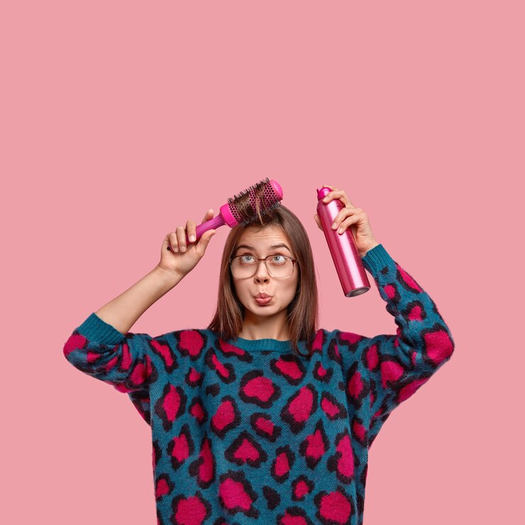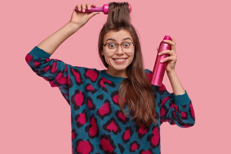 - Используя плоскую расчёску, создайте объёмный начёс на верхней части волос. Для фиксации созданного объёма закрепите корни волос лаком.