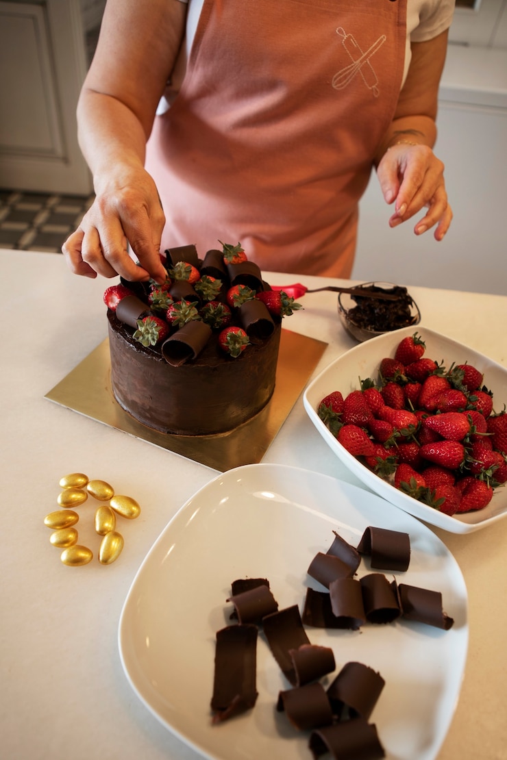 Украшение клубникой в шоколаде по-прежнему пользуется большой популярностью. Этот способ несложен в исполнении, но выглядит весьма эффектно. Для этого нужно отобрать крупные и привлекательные ягоды клубники, покрыть их растопленным шоколадом и поместить в морозильную камеру до полного застывания. Затем этими ягодами декорируют торт.
