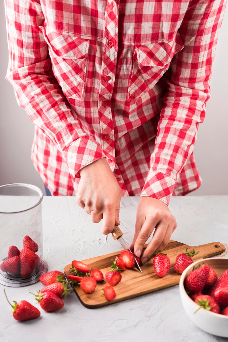 Перед дальнейшей обработкой клубнику следует подготовить. Это включает в себя сортировку ягод для удаления поврежденных, удаление листьев и плодоножек. Затем клубнику моют и разрезают каждую ягодку вдоль пополам.