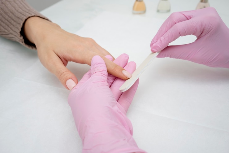 - Начинают подготовку ногтевой пластины, для этого кутикулу отодвигают с помощью апельсиновой палочки. Затем берут пилку с абразивностью 220 грит и шлифуют ею всю поверхность ногтевой пластины. Использование такой пилки позволяет убрать незначительные дефекты и выравнивания.