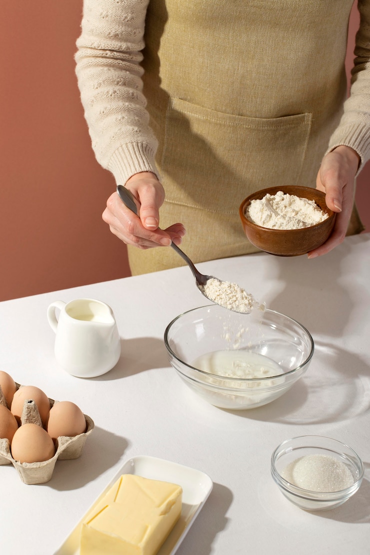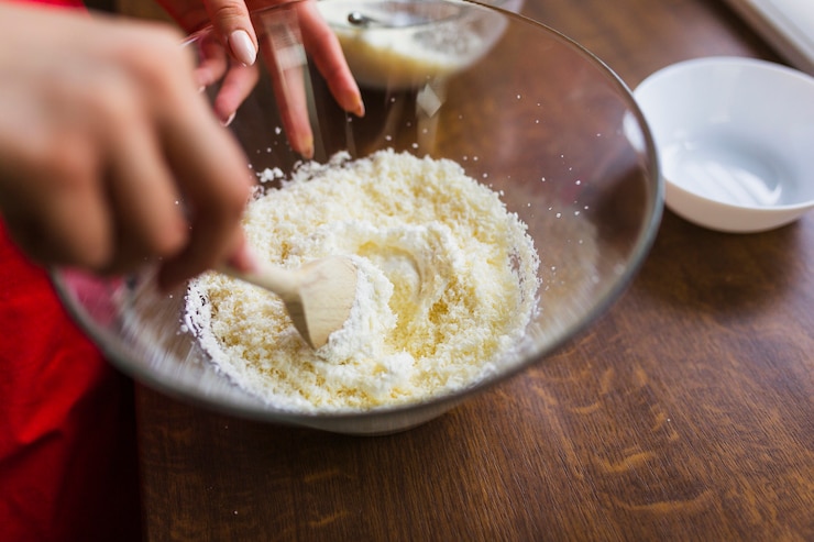 - Сначала кефир слегка подогревают, затем добавляют его в творожную массу, а в завершение добавляют муку.