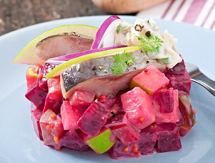 - Свеклу добавляют в последнюю очередь, а блюдо смазывают майонезом.