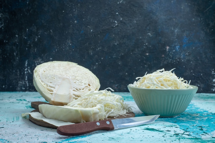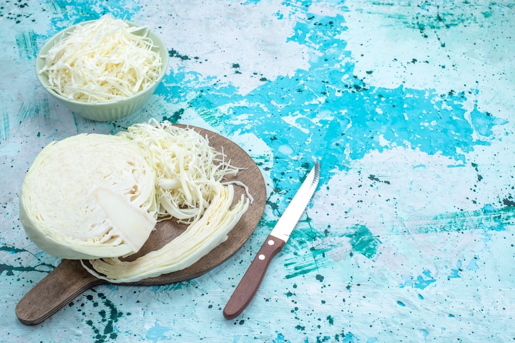 - Вилок разделяют на четыре части, удаляют кочерыжку и нарезают тонкими ломтиками.