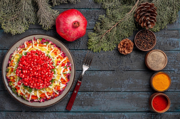 Включение разнообразных специй и приправ, в том числе и в салаты, является современной тенденцией в кулинарии, которая ранее не была свойственна русской кухне.