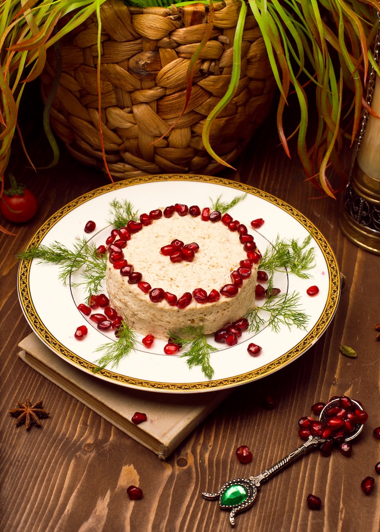 - Украшаем слоеный салат, приготовленный на Новый год по данному рецепту с фото, тонкими узкими пластинами семги, выкладывая их ромбиками, делаем розочку из помидор, добавляем в украшение листики петрушки и зерна граната.