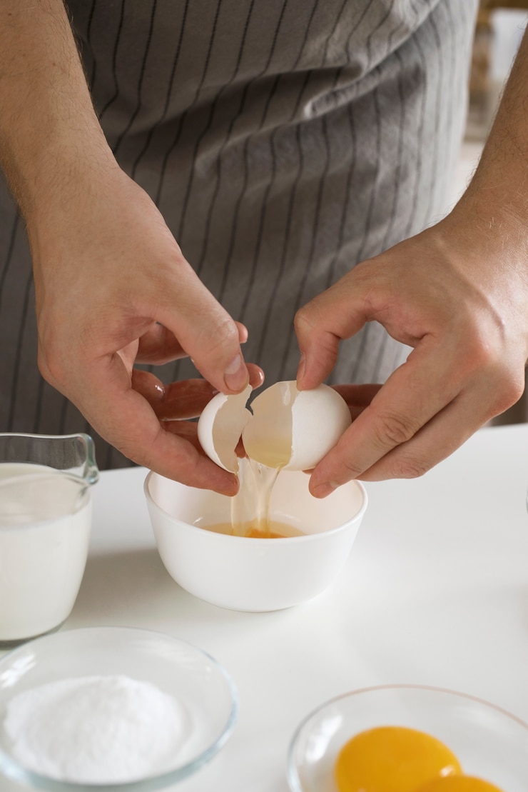 - В высокую емкость разбиваем яйцо, при этом важно сохранить целостность желтка.