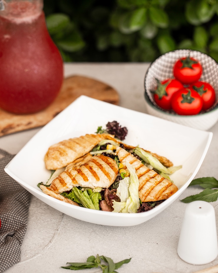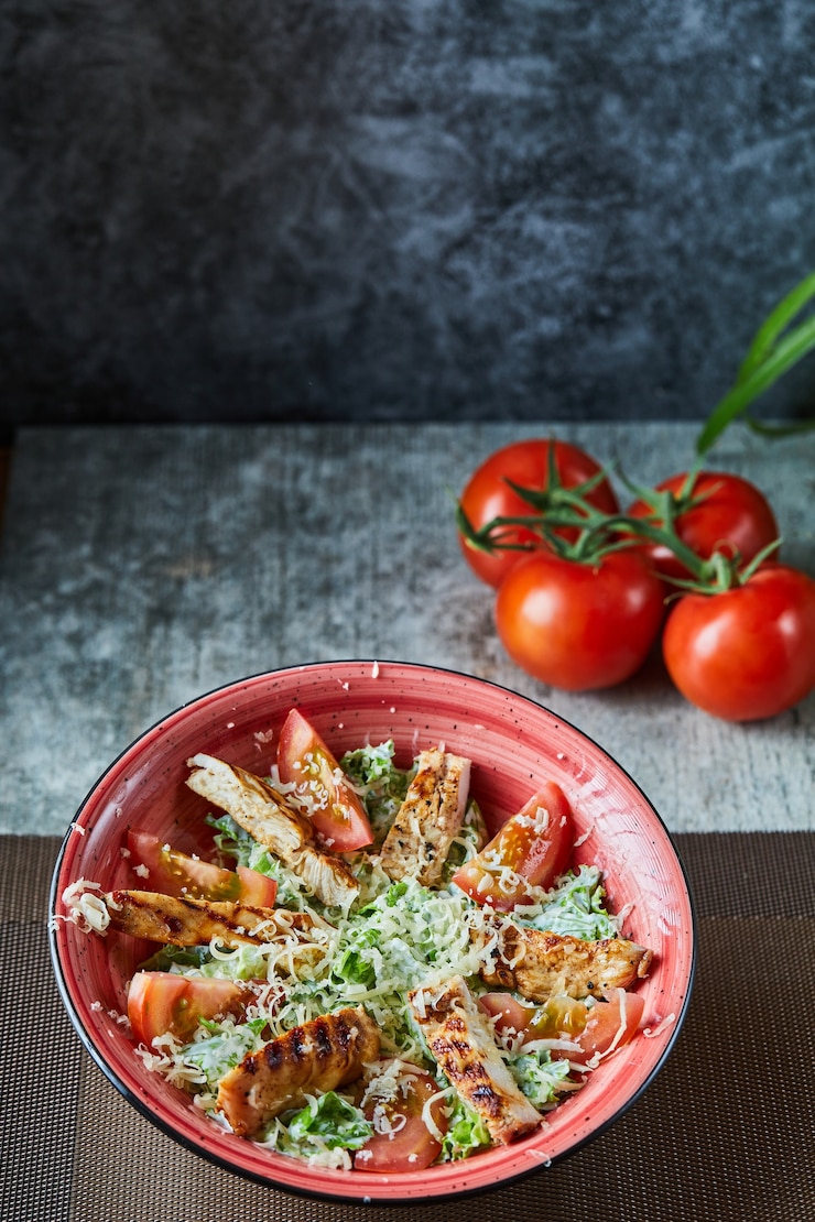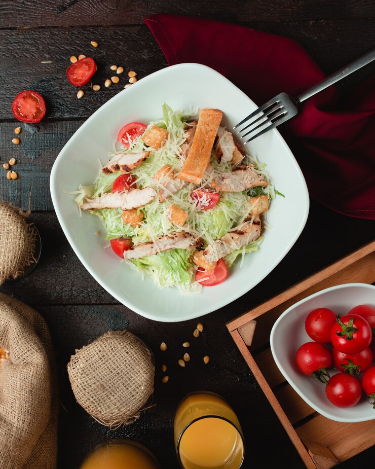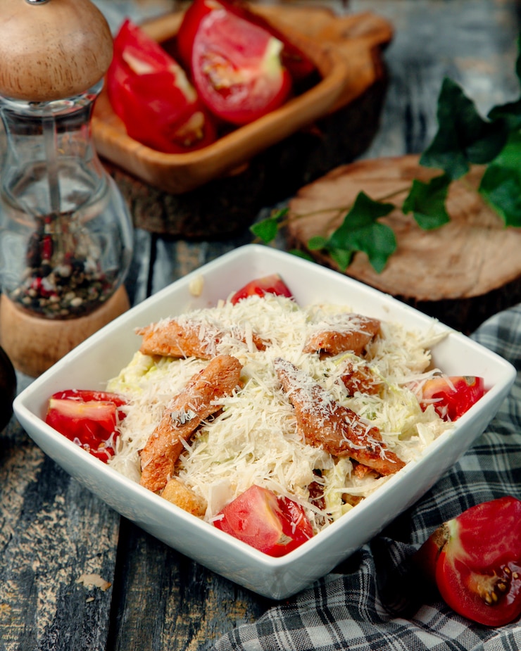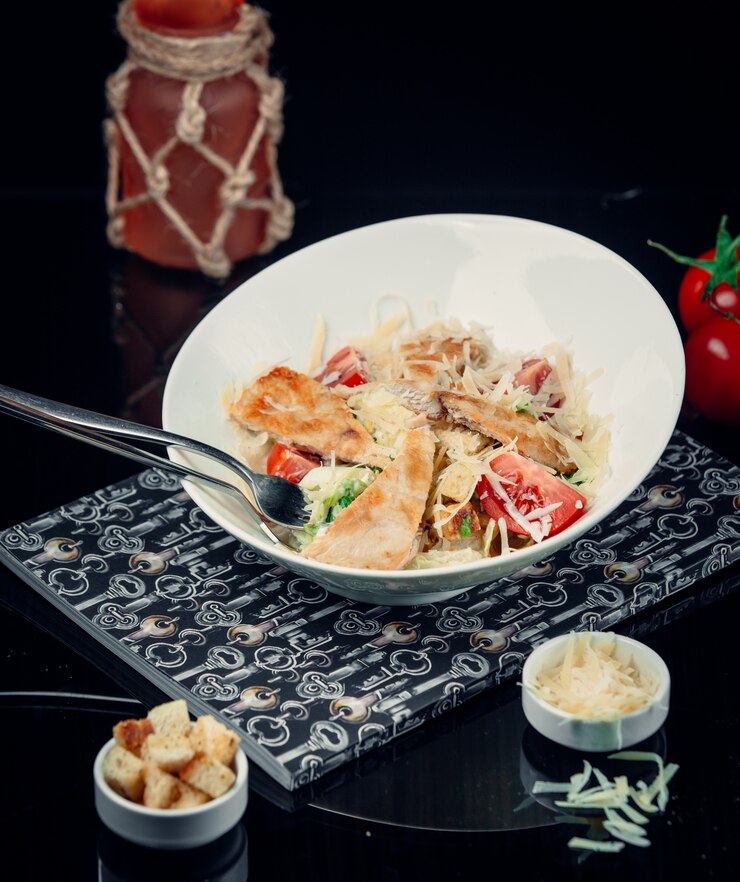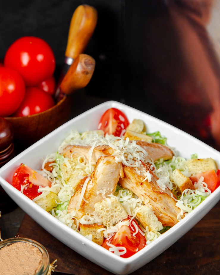 Приготовьте салат, достойный ресторанного меню, с курицей, помидорами и хрустящими сухариками: пошаговая инструкция