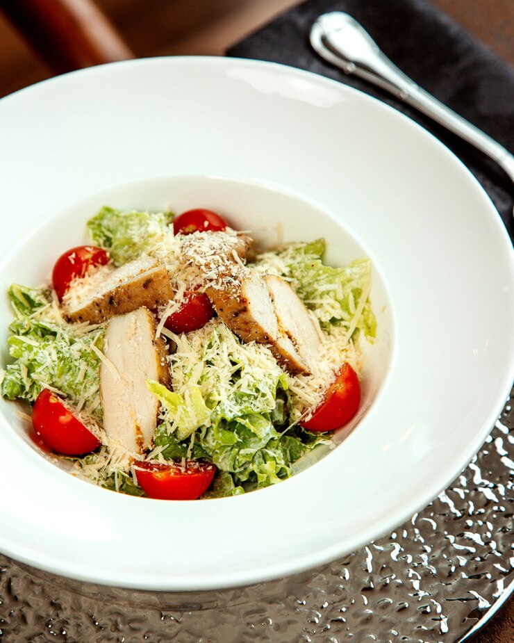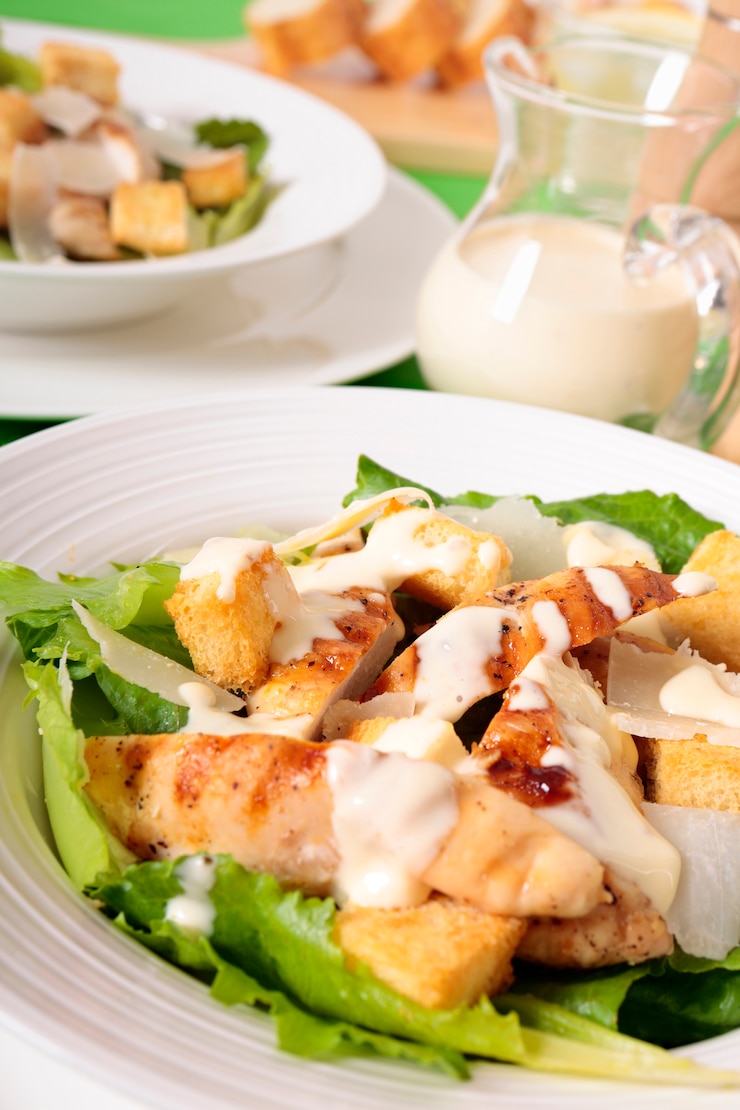 - «Цезарь» с курицей можно приготовить дома. Рекомендуется подавать блюдо сразу же после его приготовления. Полученный салат отличается низким содержанием калорий.