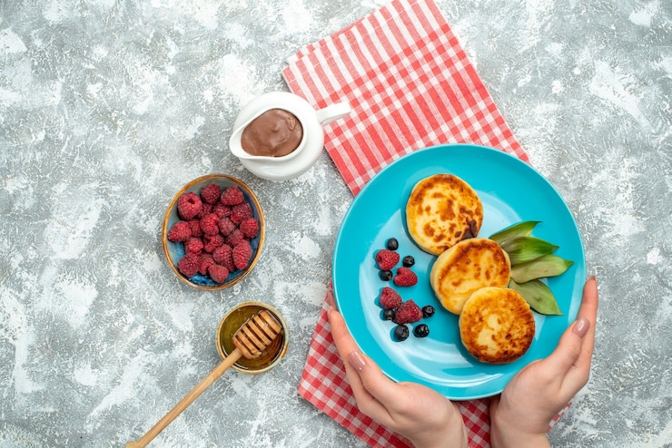 - Выкладываем аппетитные и полезные сырники, приготовленные с соблюдением принципов здорового питания, на привлекательную тарелку.