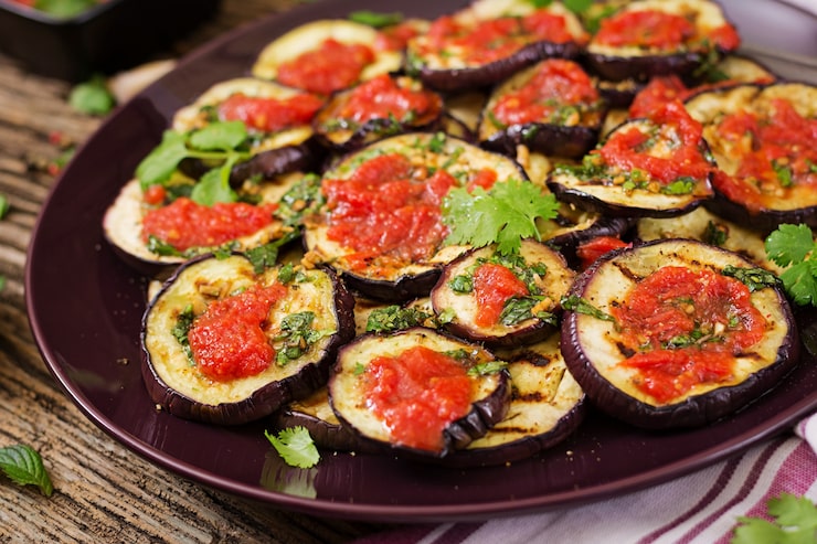 Баклажаны, тушеные в томатном соусе с добавлением острого красного перца и чеснока