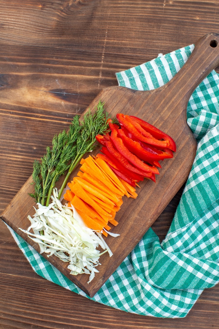 - Собираем все необходимые ингредиенты и нарезаем их произвольными кусочками, например, кубиками. Однако не следует измельчать овощи слишком мелко, за исключением лука и чеснока, поскольку лечо – это не икра, и все компоненты должны быть различимы по вкусу.