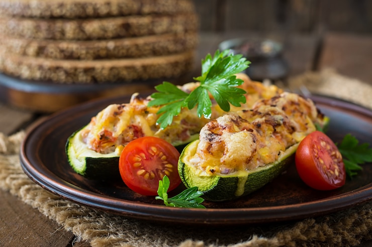 - Сок из емкостей с овощами удаляется, и овощи заполняются начинкой. Затем их посыпают тертым сыром. Заготовки перекладывают на противень и выпекают в духовке в течение получаса при температуре 180 градусов Цельсия℃.