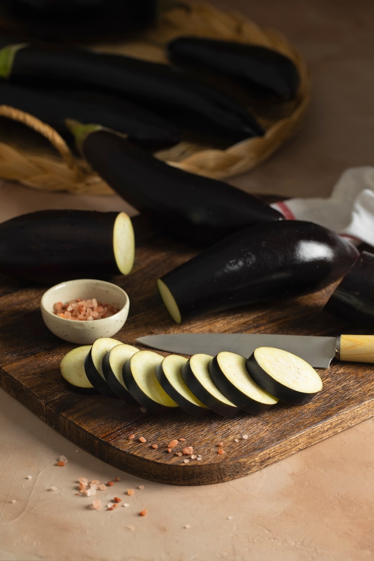 - Нарезаем баклажаны ломтиками, солим и оставляем в стороне на 15 минут, чтобы ушла горечь. После этого овощи промываем в прохладной воде и просушиваем, используя чистое полотенце.
