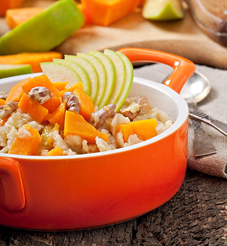 Это блюдо из риса с тыквой и яблоками будет уместно как в постном меню, так и в качестве обычного завтрака или обеда.