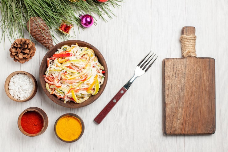 - Чтобы салат на Новый год получился удачным, необходимо уделить особое внимание приготовлению заправки. Важно, чтобы она была вкусной и обладала умеренной остротой.