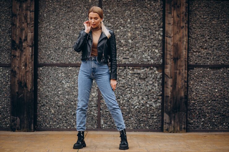 - Косуха очень круто выглядит в комплекте с узкими джинсами скинни. При этом верх может быть любого цвета. Если выбрана черная модель куртки, добавить яркости можно с помощью контрастной блузы или шарфа.