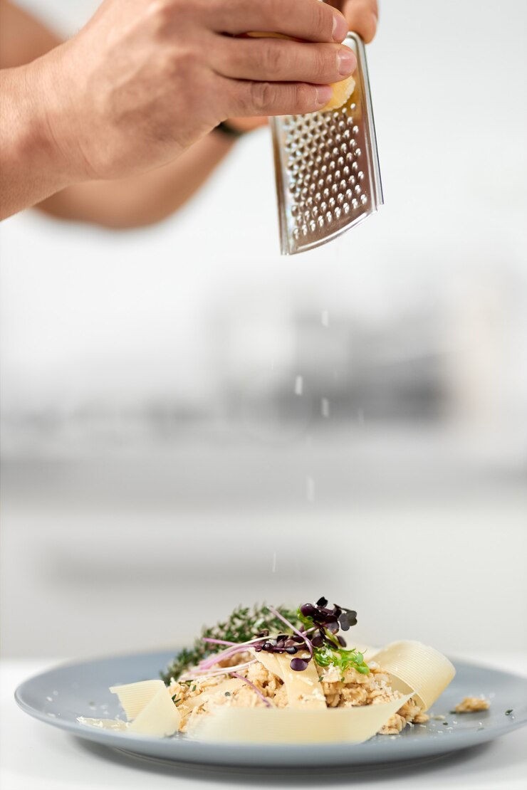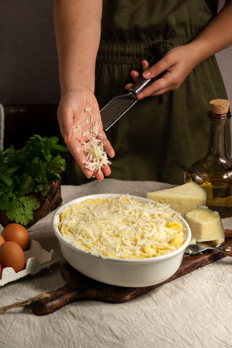 - Сыр натирают на мелкой терке. Отваренный картофель пропускают через терку с крупными ячейками.