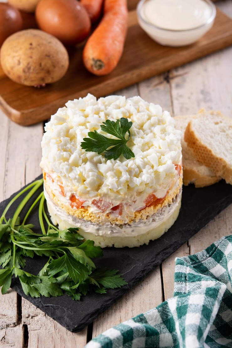 После того, как салат охладится в течение нескольких часов, убедитесь, что все слои достаточно пропитались. Затем снимите кольцо и украсьте салат веточками укропа, а также используйте морковь для вырезания декоративных цветочков.