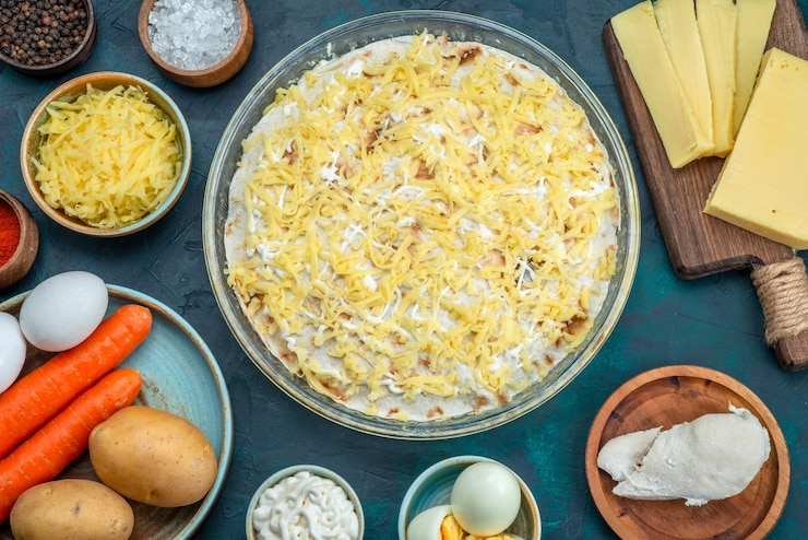 - Замороженные белки натирают на терке, сверху добавляют сыр, а затем все смазывают майонезом.