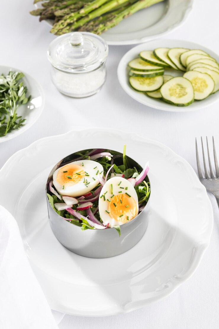 - Если нет сервировочного кольца для сборки салата, используйте глубокую миску, выстелите ее пищевой пленкой, затем выложите первый слой из яичных белков и покройте их соусом.