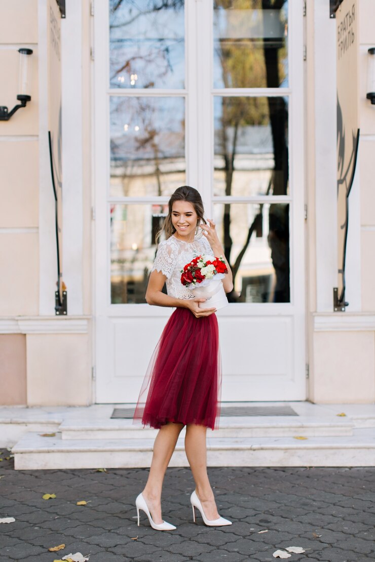 - С юбкой плиссе. Этот элемент дизайна придаст образу одновременно воздушности и элегантности.