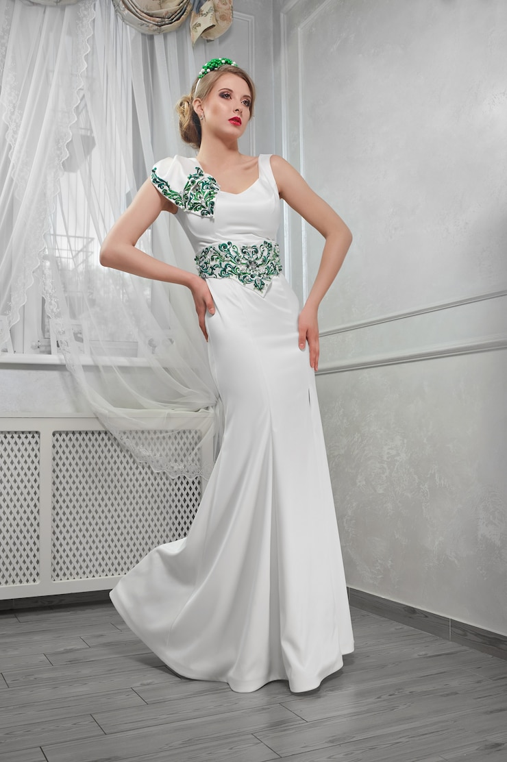 - Атлас, шелк, шифон – эти струящиеся и невесомые ткани прекрасно подчеркивают изящество и воздушность любого кроя. Благодаря им можно создавать роскошные многослойные ансамбли, а также платья со шлейфом и декоративными элементами.