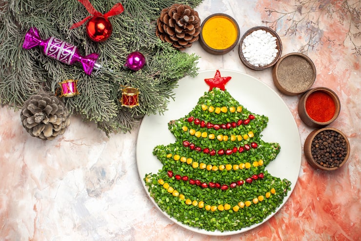 Любой салат можно оформить в виде Деда Мороза, Снегурочки, сапожка или варежки. Шубки можно создать из томатов и красного перца. Косичку Снегурочки можно выполнить из спагетти, а лица вырезать из сыра. Для украшения также можно использовать яичные белки, окрашенные в различные цвета.