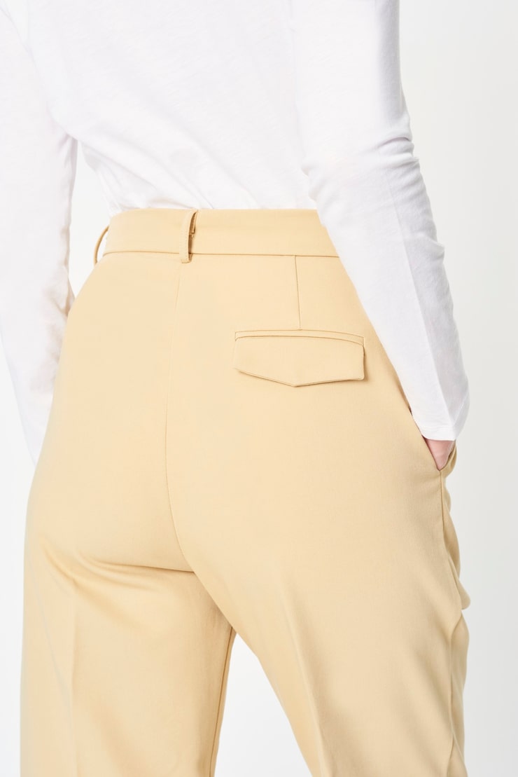 - С высокой талией. В коллекциях каждого бренда, представленных на недавних модных показах, безусловно, были представлены брюки с завышенной талией. Исходя из этого, можно заключить, что данная модель является главным трендом текущего сезона. Это вполне объяснимо, поскольку такие брюки сочетают в себе удобство, функциональность и эффектный внешний вид. Кроме того, они помогают визуально скорректировать некоторые особенности фигуры, например, скрыть область живота. Таким образом, модные брюки с высокой талией в 2020 году – отличное решение для женщин с пышными формами. Часто такие брюки дополняются стильным поясом, что придает образу завершенность.