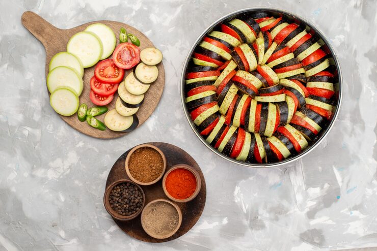 - Овощи, предварительно вымытые, нарезают тонкими кружками и выкладывают в смазанную форму для запекания.