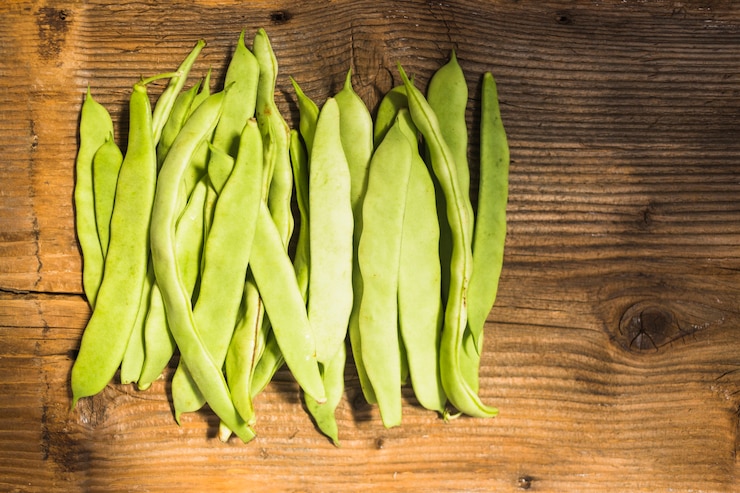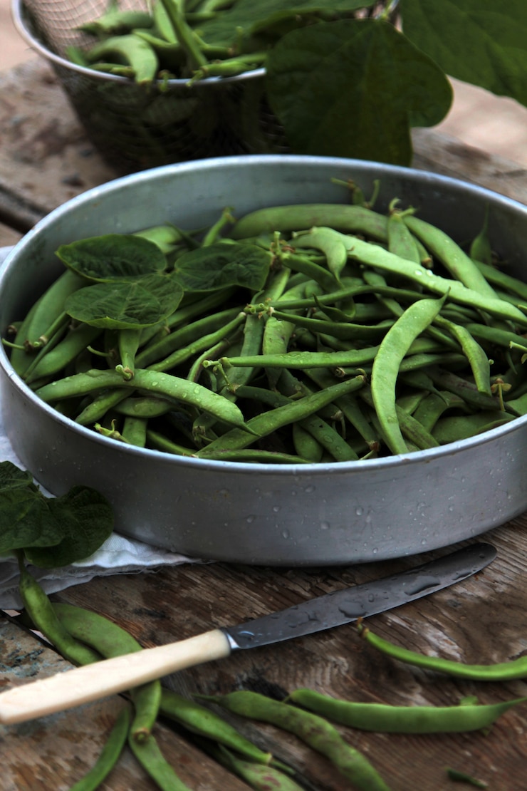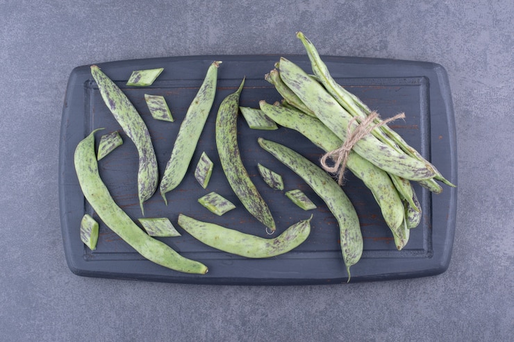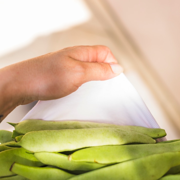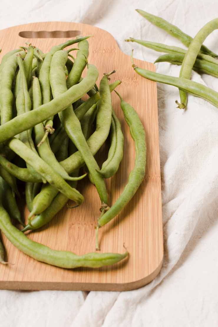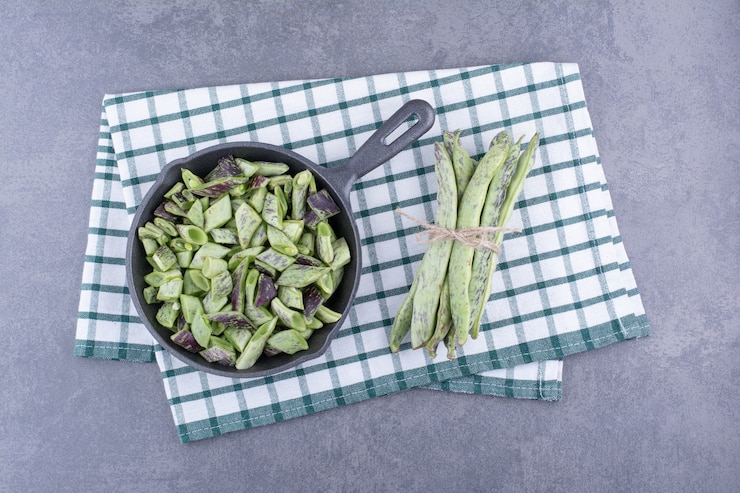 - Срежьте кончики со стручков с обеих сторон, затем промокните их на полотенце. Бобы помещают в кипящую воду на 5 минут.