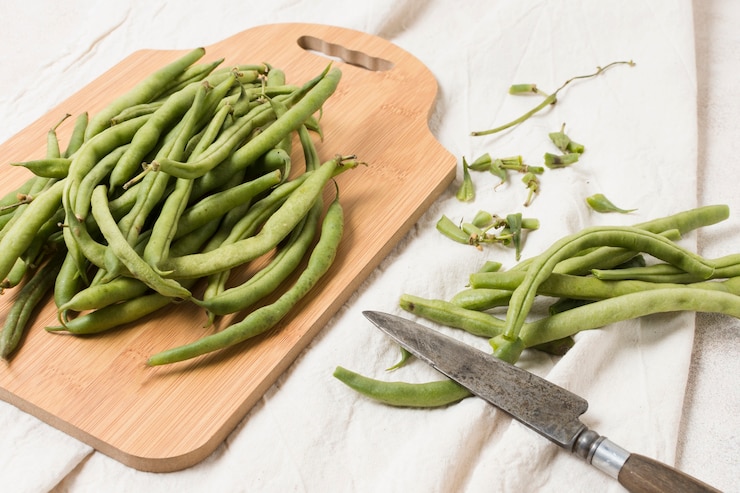 - Обсушиваем промытую фасоль на кухонном полотенце, обрезаем концы стручков с обеих сторон и нарезаем их крупными ломтиками.