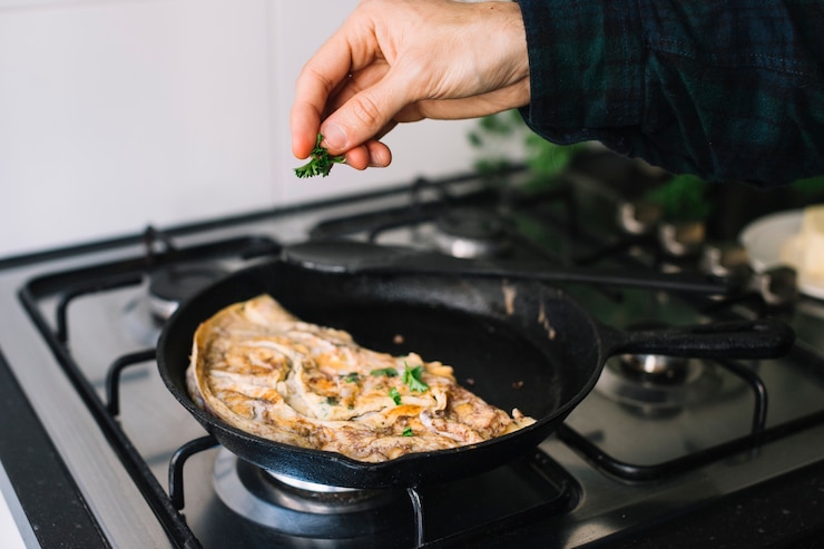 - Выкладываем яйца на сковороду, добавляем соль и перец по вкусу, затем перемешиваем.