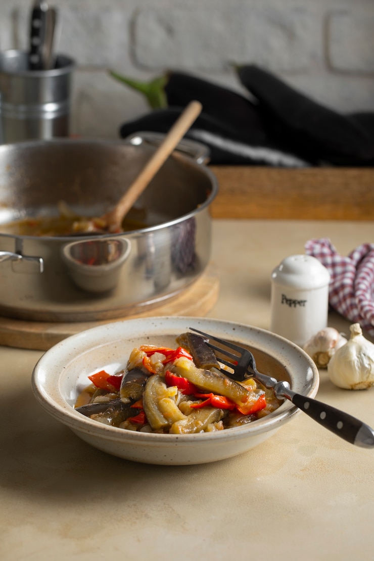 - Их слегка обжариваем, добавляем специи и перемешиваем с баклажанами. Затем накрываем крышкой и тушим на медленном огне около 10 минут.