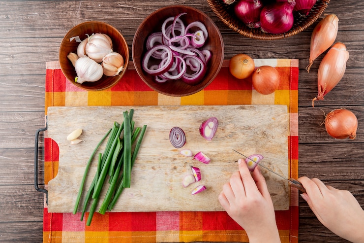 - С луковицы удаляем верхний слой, нарезаем тонкими полукольцами.