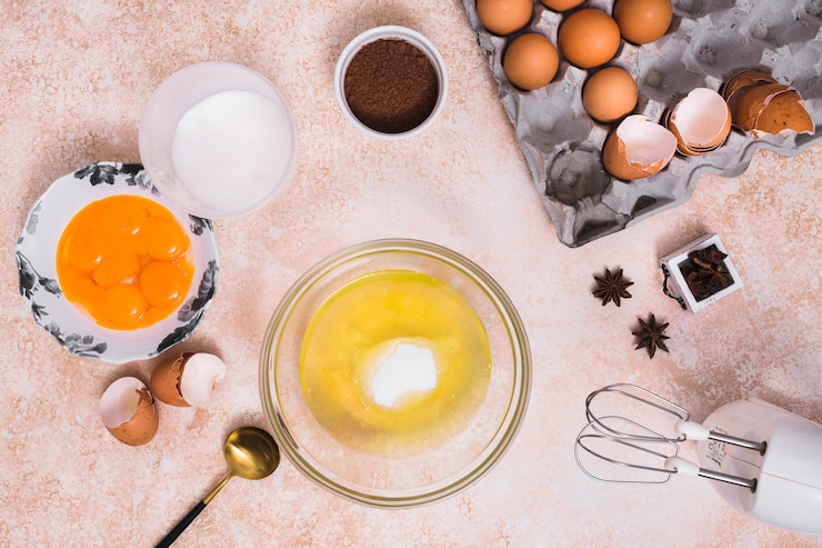 - Яйца разбиваем в миску, добавляем соль и сахар, затем взбиваем, пока кристаллы полностью не растворятся.