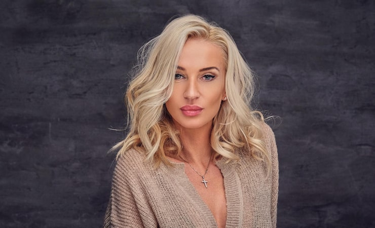 - Блонд – прекрасный вариант. Светлые оттенки помогают скрыть недостатки и акцентируют внимание на цвете глаз. Рекомендуется уделить внимание тёплым тонам.