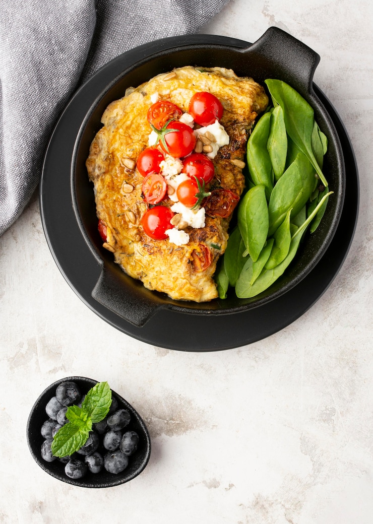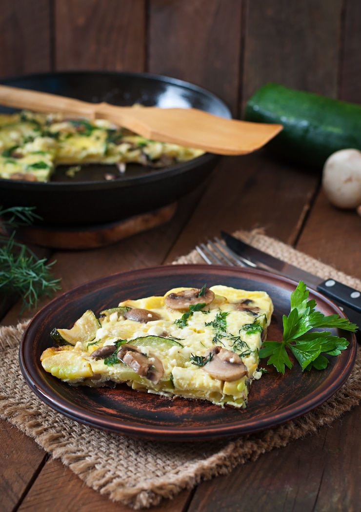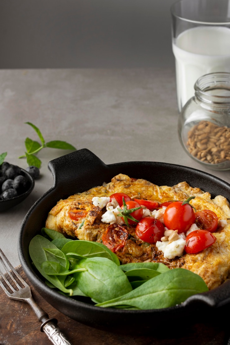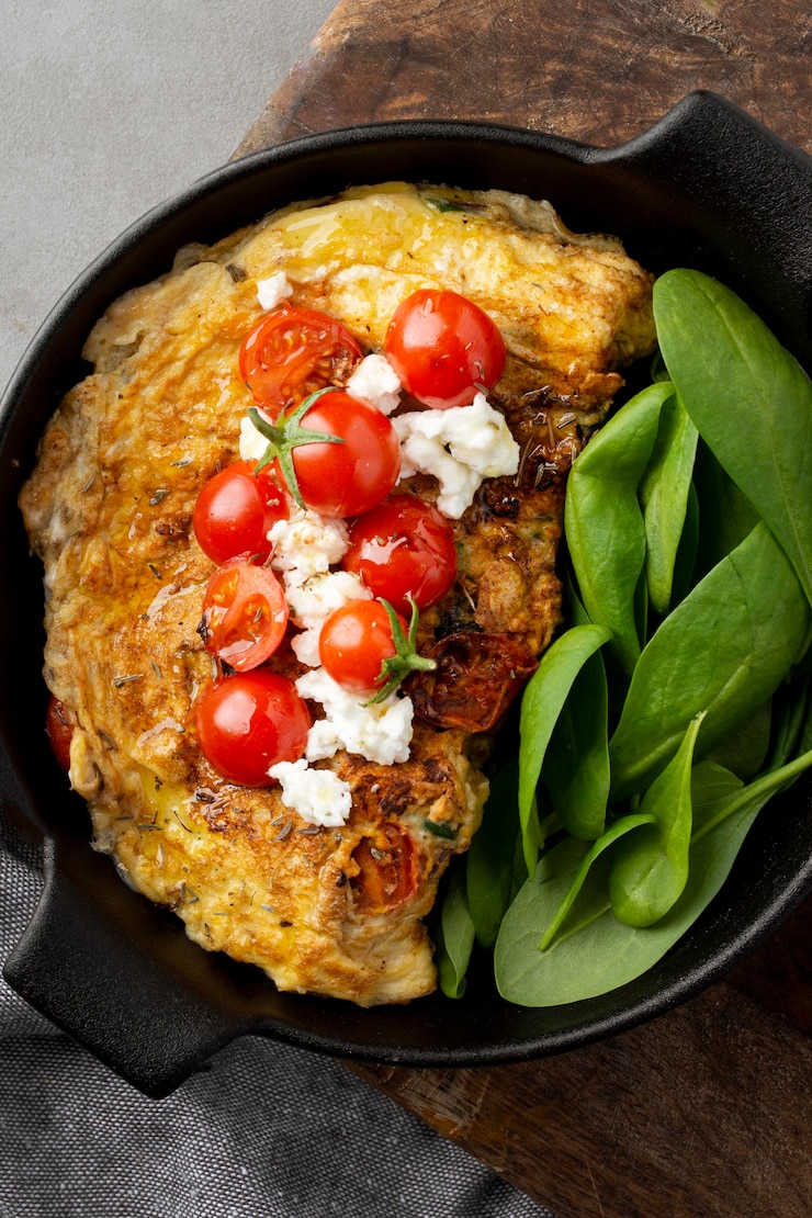 - Начните с разогрева сковороды с маслом, затем вылейте на нее ингредиенты для основы омлета и распределите их равномерным слоем. Обжарьте омлет с одной стороны, переверните и уменьшите температуру.