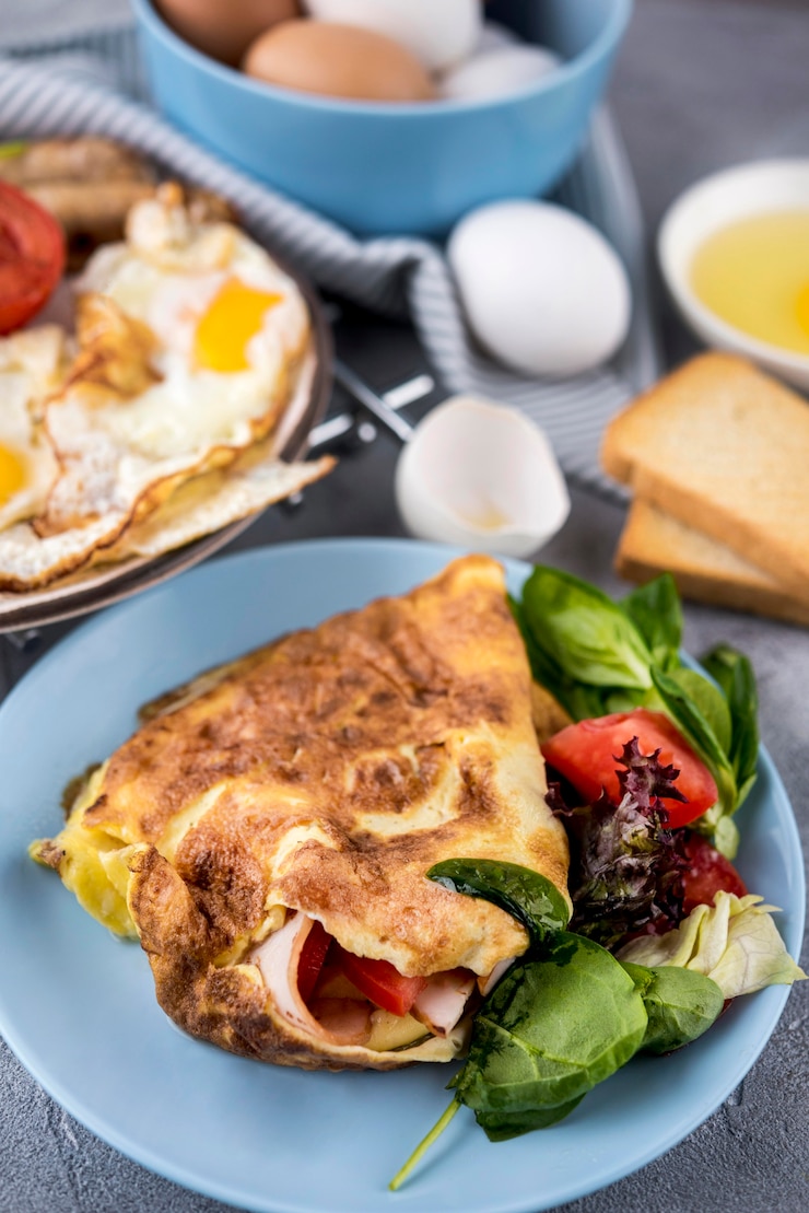 - Повторяем процесс приготовления и второго омлета, подаем его горячим вместе с овощной нарезкой.
