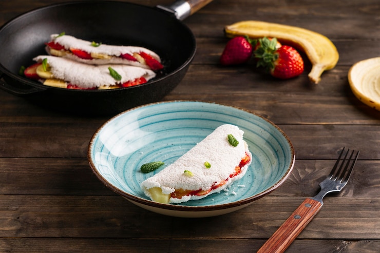 - Начинку выкладывают на половину готового омлета, расположенного на тарелке, затем омлет разрезают пополам и соединяют половинки слоем белкового суфле.