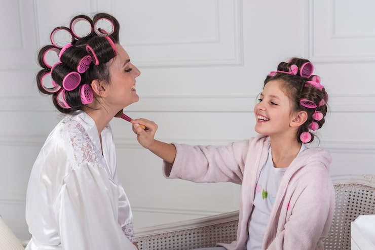 - Волнистые волосы, будь то локоны или кудри, выглядят не менее привлекательно. Создать такую прическу под силу и маме без посторонней помощи. Для этого достаточно накрутить пряди и зафиксировать укладку с помощью мусса или лака. Этот вариант особенно хорош для женщин с тонкими волосами, поскольку он придает им объем. Локоны можно сформировать различными способами: с помощью плойки или бигуди, выбирая тот, что соответствует желаемому результату. Если заправить передние пряди назад, прическа станет выглядеть более оригинально.
