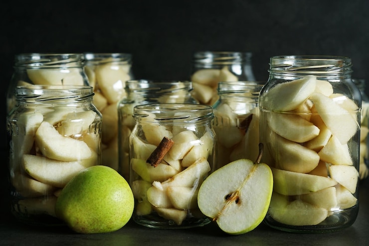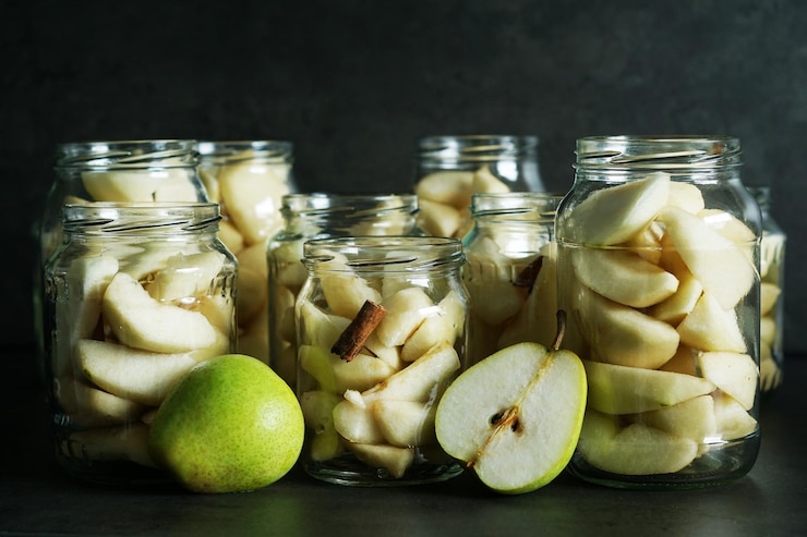 - Подготовленные фруктыТолком нарезанные дольки плотно укладываем слоями в банки. Все сахар делим равномерно по всем заполненным банкам.