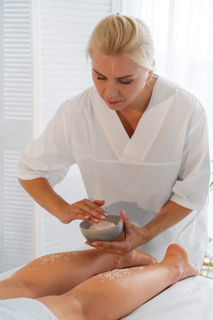 - перед проведением водных процедур следует сделать массаж жесткой щеткой или сухим скрабом из соли, который усилит кровоток в проблемном месте перед нанесением антицеллюлитного состава;