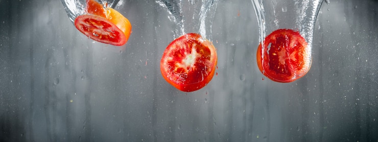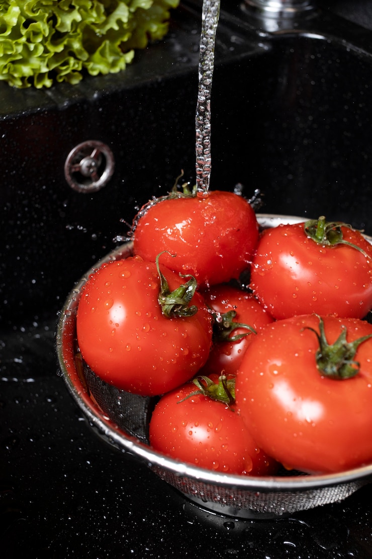 - Помидоры, предварительно промытые и обсушенные, укладывают в банку, но не заполняя её до края.