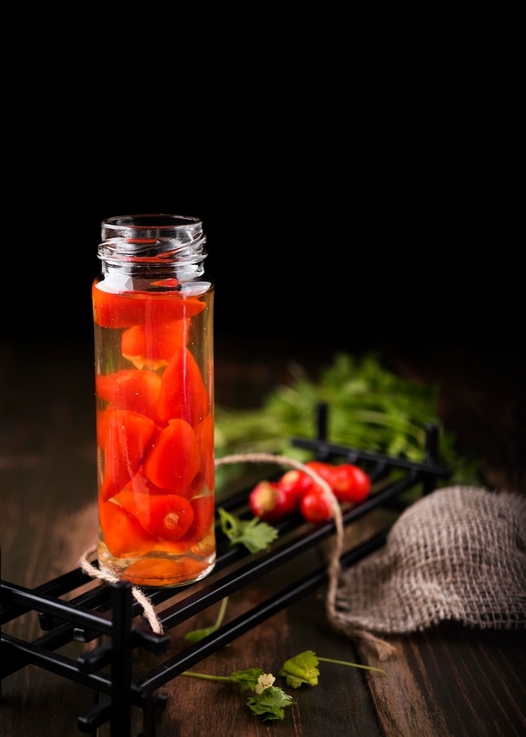 - Для приготовления необходимо проколоть помидоры один раз зубочисткой и поместить их в банку со специями.