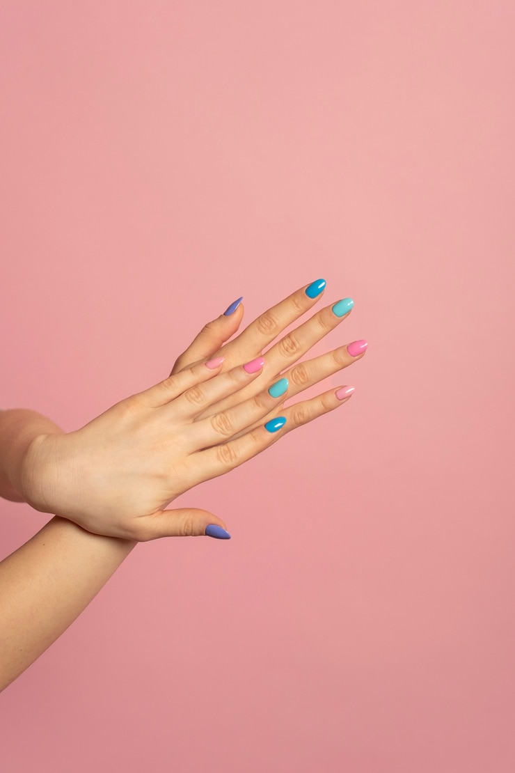 Среди ярких цветов, используемых в nail-art, популярны сине-багровый, зелёный, оранжевый и жёлтый оттенки. нюдовые оттенки.