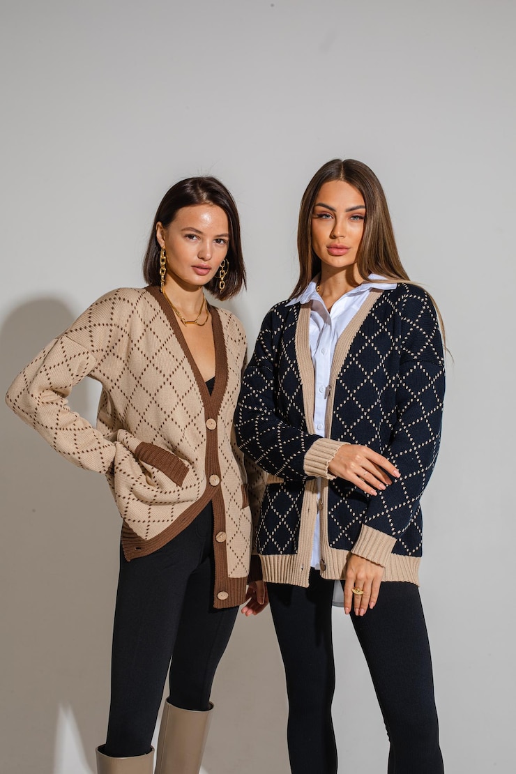 В моде будут кардиганы с пуговицами, с кнопками, на молнии или модели с запахом и поясом. Пуговицы стоит выбирать крупные. Их располагают в один или два ряда. Возможно застегивание изделия на несколько пуговиц, оставив остальные незастегнутыми.
