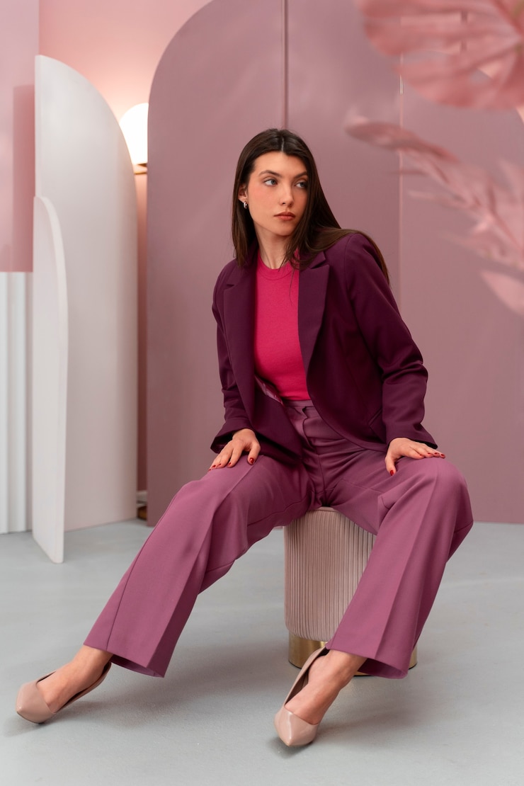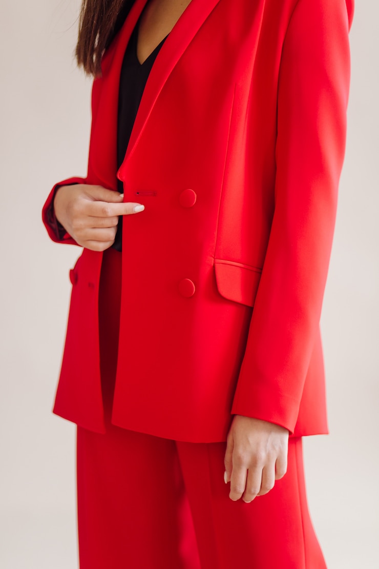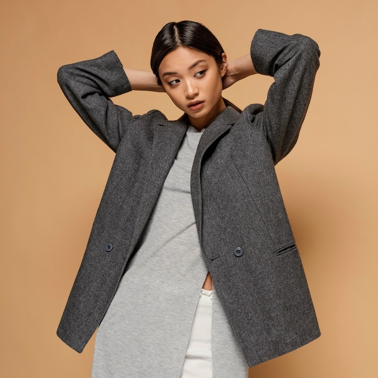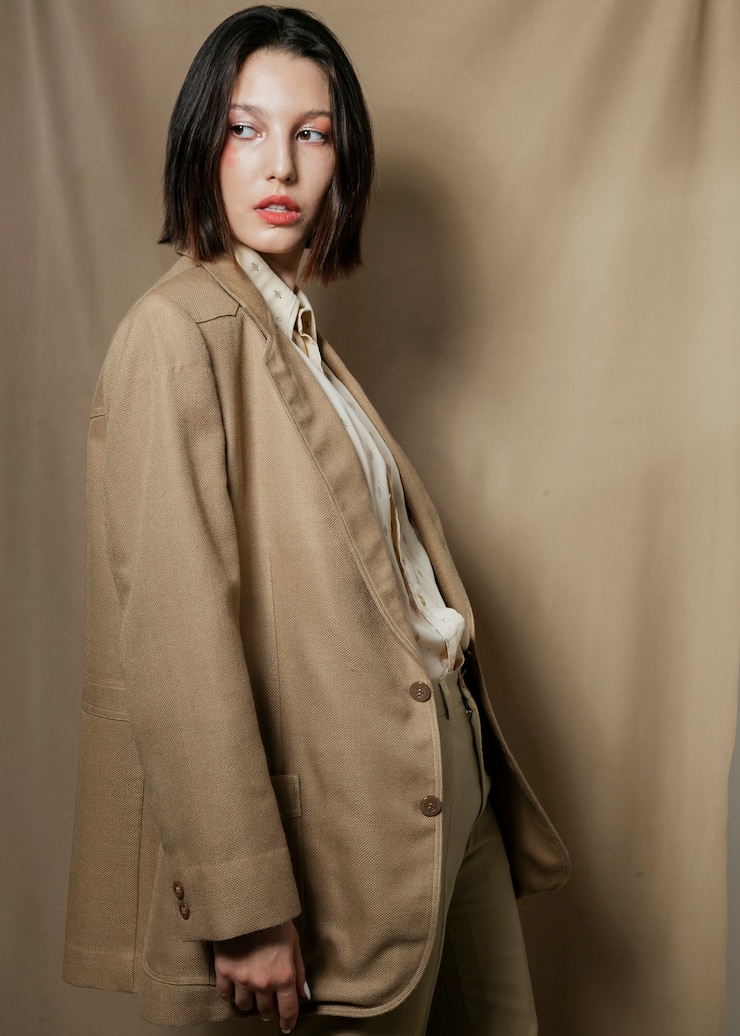 Свободные пиджаки по-прежнему актуальны и помогают визуально уменьшить рост, скрывая фигуру под объемным кроем. Их универсальность заключается в простоте сочетания с различными предметами гардероба, включая верхнюю одежду. Например, под пиджак можно надеть кожаную куртку, жилетку или кофту, формируя непринужденный многослойный ансамбль.