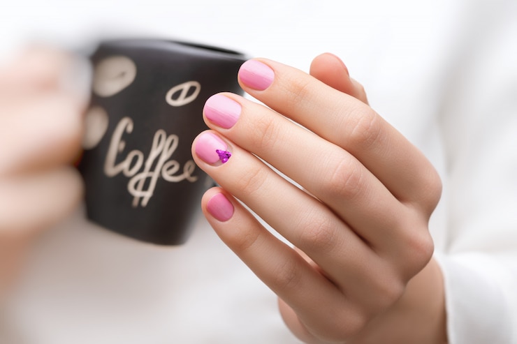 Для придания изюминку традиционному маникюру можно добавить украшение на один из пальцев, например, стразы, рисунок или элементы в технике «битое стекло.